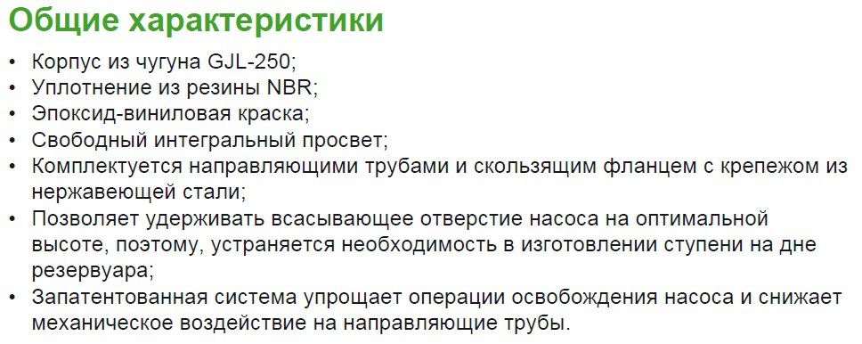 Донное соединительное устройство DAC с вертикальным напорным отверстием позволяет выполнять техническое обслуживание насоса без опорожнения резервуара, а также удерживает всасывающее отверстие насоса на оптимальной высоте. Корпус выполнен из чугуна, уплотнение из резины NBR.