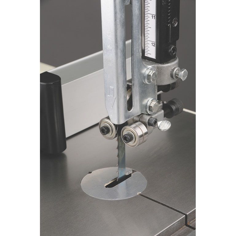 С тыльной стороны сверху станка расположен узел регулировки натяжения ленты, оснащенный индикатором (его показания сравнивают с шириной установленной ленты) и рычагом для быстрого натяжения / ослабления. Высоту установки верхних 3-точечных роликовых направляющих меняют двумя рукоятками: вращая одну, производят фиксацию, вторую - перемещают узел. Ременная передача двухскоростная, что позволяет уверенно работать с широким спектром материалов.