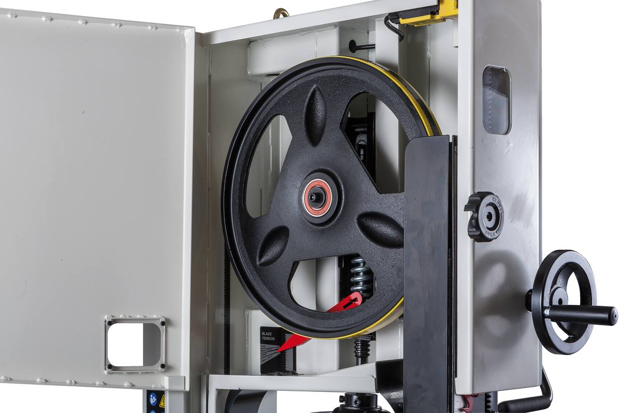 Механизм натяжения и центрирования ленты включает в себя две группы трехроликовых направляющих на шарикоподшипниках, стрелочный индикатор уровня натяжения, регулирующие маховики, два смотровых окошка и рычаг быстрого натяжения-ослабления. Он не совсем обычен, поскольку имеет не два, а три фиксированных положения: рабочее (плотно натянуто), для хранения (лента ослаблена, но держится на шкивах) и сервисное (для замены полотна). Чтобы улучшить плавность работы, использованы чугунные шкивы с массивным телом, а не в виде спицованных колес, как раньше.