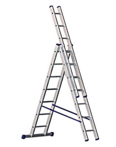 Универсальная трехсекционная лестница Алюмет 6314 3x14 выполнена в виде стремянки с выдвинутой третьей секцией. Сочетает в себе функции двухсторонней стремянки и приставной лестницы. Лестница оснащена крюками-фиксаторами и траверсой для устойчивой опоры шириной 120 см.