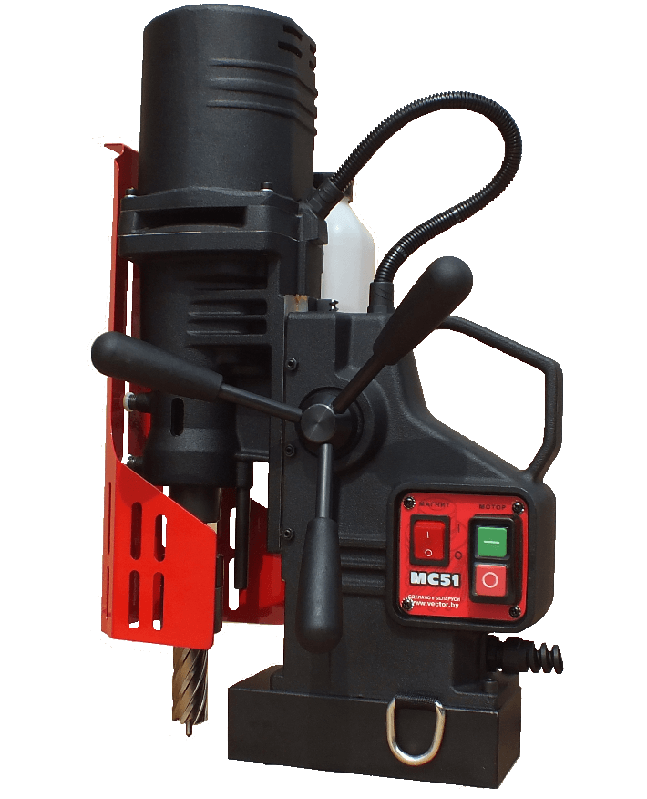Выполнение работ на магнитных сверлильных машинах МС-51 происходит с максимальной степенью комфорта и безопасности. Обладая электронной системой плавного пуска дает возможность делать отверстия в трубах, или же осуществлять сверление внахлест. Заменяемый шлицевой хвостовик ротора, исключает дорогостоящую замену ротора при износе. Интегрирована система автоматической подачи жидкости под высоким давлением, чем обеспечивается высокая надежность и безопасность. Данная система уже идет в стандартной комплектации.