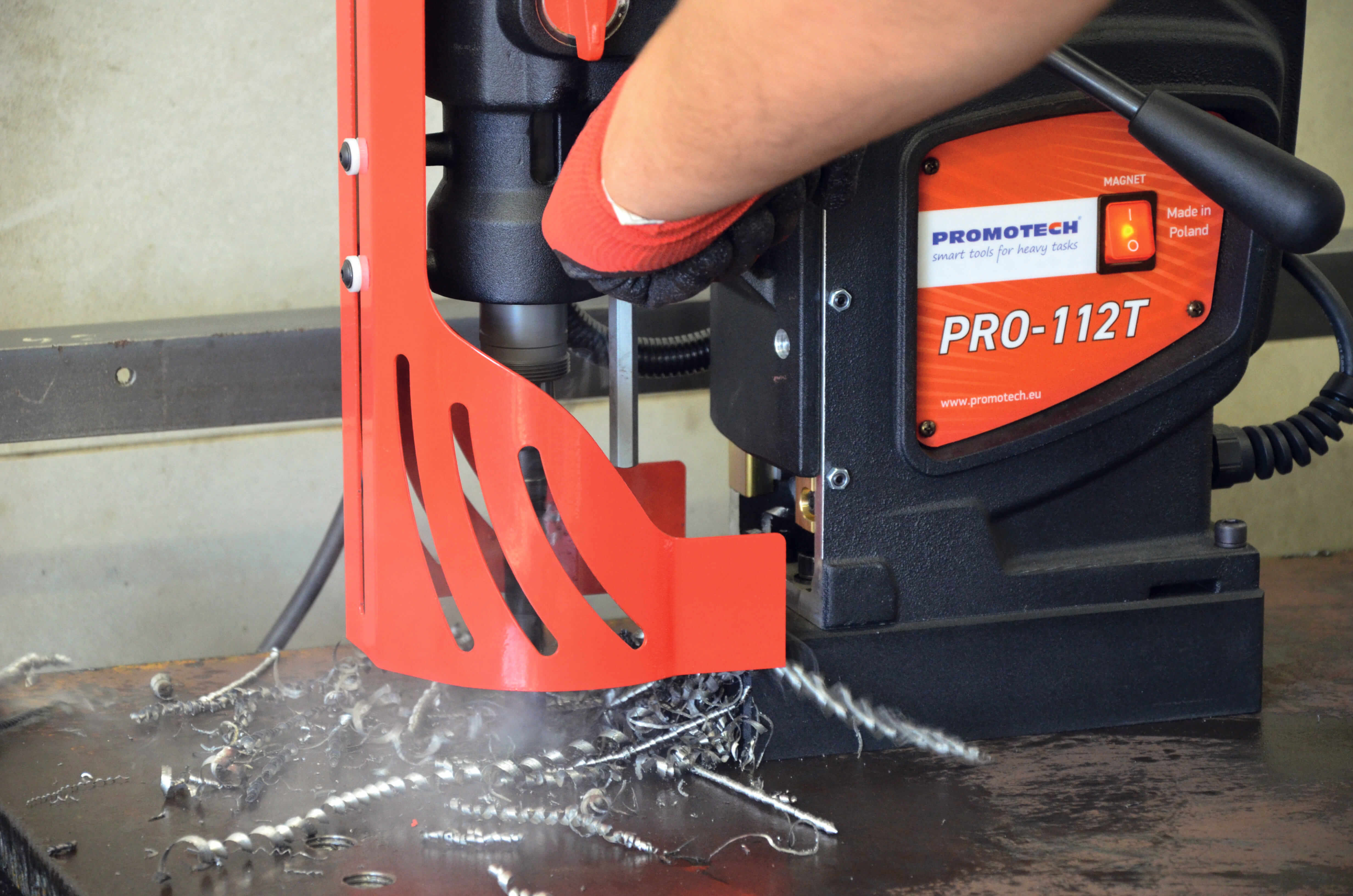 Сверлильный станок на магнитном основании PRO 112T– это новое поколение современных многофункциональных станков высокой мощности от Promotech. Магнитная сверлильная машина PRO -112Т представляет из себя промышленный сверлильный магнитный станок с большим крутящим моментом. Особое преимущество станка это литая конструкция корпуса, где привод и подвижные части образуют единый конструктивный элемент корпуса, обеспечивая жесткость крепления и точную фиксацию станка, его устойчивость, которые до этого время достигалась только в стационарных станках. Моноблочная конструкция , редуктор-суппорт, саморегулирующиеся направляющие исключают появление люфта, тем самым увеличивают срок эксплуатации и надёжность машины PRO 112T. В сверлильной машине на магнитном основании применен 4-х скоростной металлический редуктор позволяющий работать на малых оборотах, обеспечивая высокий крутящий момент без потери мощности.
