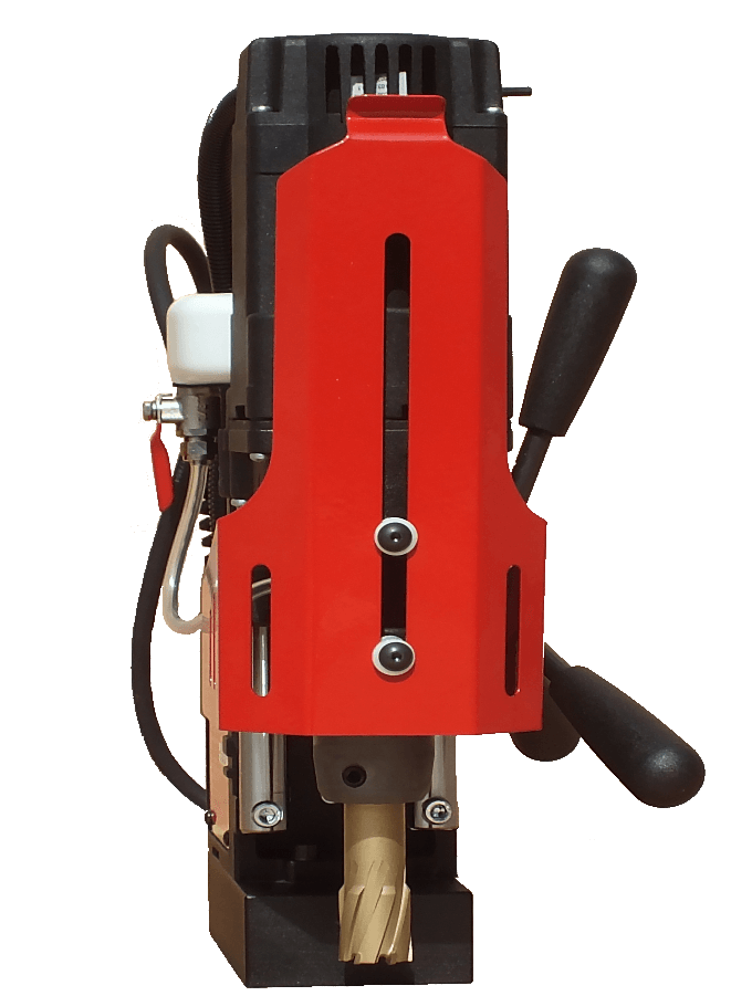 Минимальная высота магнитного станка всего 306 мм и вес не более 10 кг позволяет выполнять работы в местах с ограниченным пространством. Максимальная составляет 376 мм. Имеет интегрированную систему подачи СОЖ (смазочно-охлаждающая жидкость) в стандартной комплектации, обеспечивая при этом высокую безопасность. Характеризуется надлежащей надежностью и простотой в обслуживании. Основной рабочий инструмент сверлильной машины - корончатые сверла.