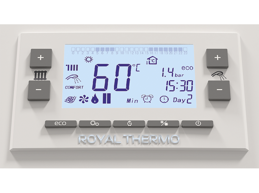 Котлы полностью автоматизированы, удаление дымовых газов происходит турбированным способом за счет принудительной тяги. Камера сгорания закрытая. Такие возможности оборудования как FULL Restart – перезапуск при перебоях с подачей газа и электричества, уникальная конструкция горелки и надежный газовый клапан, а также проверенная временем 3-электродная система розжига и контроля пламени не оставят ваш дом без тепла. Функции Сomfort для горячего водоснабжения, возможность использования комнатного термостата или режим работы от датчика уличной температуры, а также другие уникальные особенности прибора обеспечат вас максимальным уровнем комфорта при использовании котельного оборудования Royal Thermo.