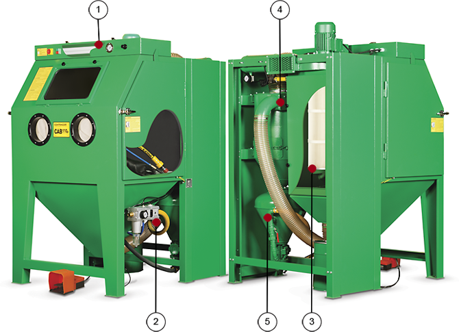 Кабина представляет собой герметичную стальную конструкцию с фильтром выбрасываемого в атмосферу технологического воздуха, с установленной напорной системой формирования абразиво-воздушной смеси.