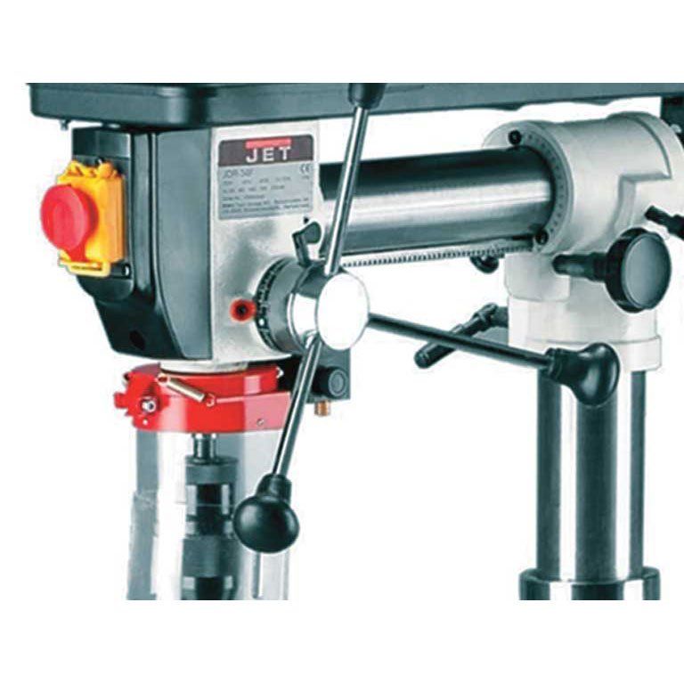 Jet JDR-34F - радиально-сверлильный станок, предоставляющий пользователю большую свободу настройки. Сверлильная часть у этой модели закреплена на горизонтальной колонне и может перемещаться по радиусу от основной. Это позволяет просверлить ряд отверстий вдоль одной линии или адаптировать станок для конкретной работы: увеличить вылет для сверления на большом расстоянии от края крупной заготовки или уменьшить его для повышения жёсткости и точности.
