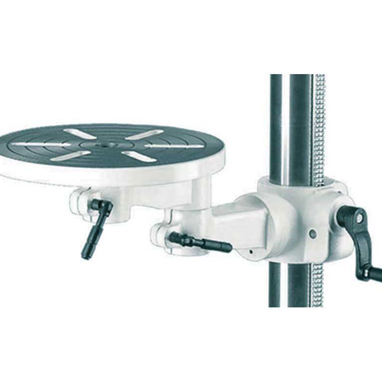 Механизм крепления сверлильной части также позволяет наклонять её на произвольный угол в пределах от 90° влево и до 45° вправо, благодаря чему возможно делать отверстия под углом к поверхности заготовки на ровно установленном столе. Сам стол - круглый поворотный с возможностью изменения высоты установки и дополнительной регулировкой в горизонтальной плоскости.