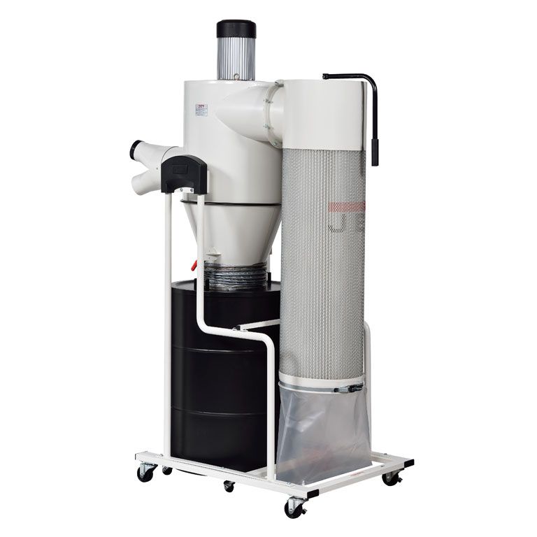 «Циклон» JCDC-3 обеспечивает постоянно высокую производительность. Его преимущества перед моделями с фильтром в виде мешка особенно заметны в сочетании с оборудованием для шлифовки, дающим много мелкой пыли. Гофрокартонный фильтр имеет большую (4,2 кв.м) площадь поверхности, оборудован рукояткой для стряхивания и очень долговечен. При работе со стружкой эффективность остается на высоком уровне – контейнер для крупной фракции имеет достаточный объем и очень легко извлекается/ устанавливается. Процедура проще, чем монтаж мешка с хомутом: «бак» на колесах подкатывается под крышку, после чего герметично ею накрывается; прижим производится одновременным движением двух рычагов. При утилизации крупной фракции мусора не приходится контактировать с мелкодисперсной взвесью, вредной для здоровья, пачкающей одежду, засоряющей мастерскую.