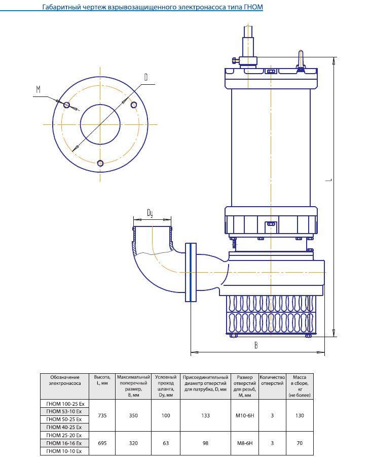 Взрывозащищённый передвижной центробежный электронасос типа ГНОМ 10-10 Ех предназначен для откачивания загрязненных грунтовых и производственных сточных вод температурой до 35°С с рН=5-10, плотностью до 1100 кг/м³ плотностью твердых частиц не более 2500 кг/м³, содержащих механические примеси до 10% по массе и максимальным размером до 5 мм, а также с примесями сырой нефти до 10% по массе, в составе которой может быть до 3% серы в несвободном состоянии и парафина до 7%.
